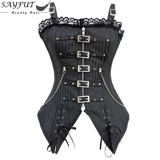 Корсет с поддержкой груди черный, красный полосатый стимпанк готический 2016 корсет платье молния и кружево до Корсеты Топ ногтей цепи украшения
